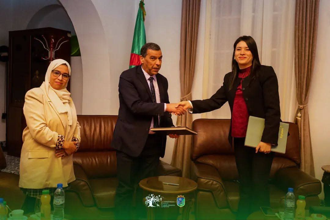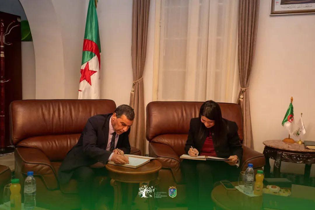Dans le cadre du renforcement des échanges scientifiques et de la mise en œuvre de projets de recherche communs dans les domaines de l’agriculture, de l’environnement et du développement durable, il a été procédé, le jeudi 20 novembre 2025, au niveau du Jardin d’Essai du Hamma à Alger, à la signature du procès-verbal de la convention-cadre entre l’Université du 20 Août 1955 de Skikda, représentée par le Secrétaire Général de l’Université, M. Rachid Chekhdnou, au nom du Recteur Pr. Boufandi Toufik, accompagnée de la responsable du Service Commun de Recherche – Pôle de Vulgarisation Botanique, Mme Nouar Houda, et le Jardin d’Essai du Hamma, représenté par sa Directrice, Mme Ben Meni Kenza.